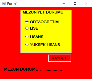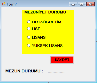 Dört tane RadioButton: Eğitim durumu seçimini yapma amaçlı kullanılmıştır. (Bunun yerine CheckBox’ta kullanılabilir.) Kullanıcı her seferinde bir tek seçim yapabilir.