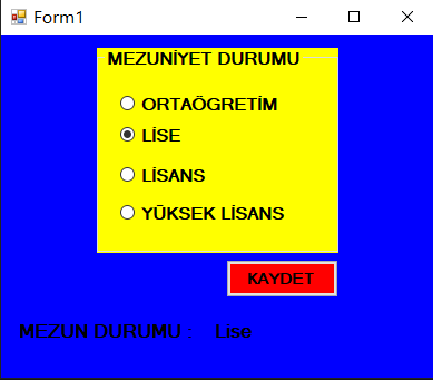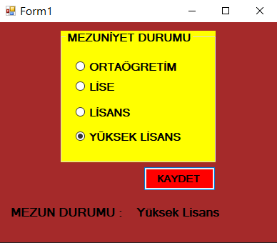 private void button1_Click(object sender, EventArgs e) { if (radioButton1.Checked == true) { label2.Text = "Ortaöğretim"; } if (radioButton2.Checked == true) { label2.Text = "Lise"; } if (radioButton3.Checked == true) { label2.Text = "Lisans"; } if (radioButton4.Checked == true) { label2.Text = "Yüksek Lisans"; } } private void radioButton1_CheckedChanged(object sender, EventArgs e) { this.BackColor = Color.Red; } private void radioButton2_CheckedChanged(object sender, EventArgs e) { this.BackColor = Color.Blue; } private void radioButton3_CheckedChanged(object sender, EventArgs e) { this.BackColor = Color.Purple; } private void radioButton4_CheckedChanged(object sender, EventArgs e) { this.BackColor = Color.Brown; } |