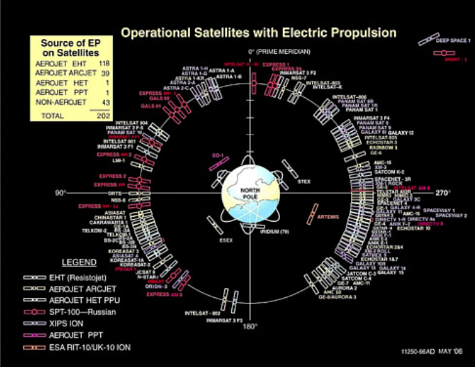 Şekilde gösterilen iticiler çeşitli tiptedir: elektrotermal hidrazin iticiler (EHT’ler), hidrazin arcjetler, ızgaralı iyon iticiler, Hall etkili iticiler (HET’ler) ve darbeli plazma iticiler (PPT).